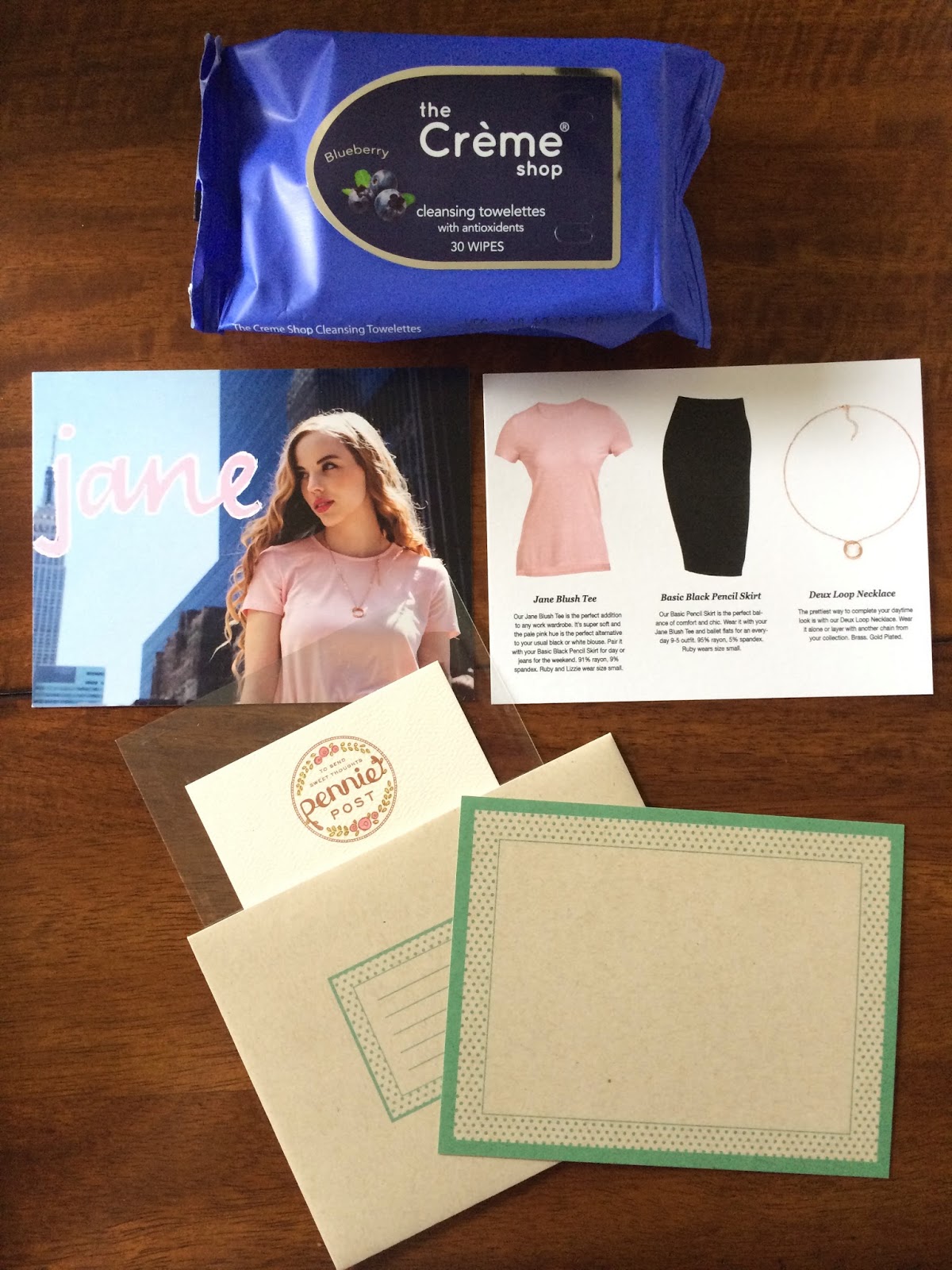 Popbasic always has a handwritten postcard and a style card, that includes different ways to style the pieces. Here are the extras this month. I think these are my favorite so far. There is a card and envelope from Pennie Post. I'm constantly using stationary, so I love this so much! There was also cleansing towelettes from The Creme Shop in blueberry. I'm excited to try these!